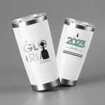 Copo térmico branco, limpo e marcante como aquela conquista. Aço inox com vedação a vácuo pra manter cada gole na temperatura ideal, do mesmo jeito que 2023 vai se manter vivo na memória.