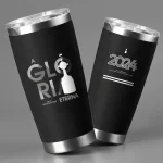 Copo térmico preto, sólido como aquela campanha. Aço inox com vedação a vácuo que mantém a temperatura do seu café tão firme quanto a defesa nos mata-matas.