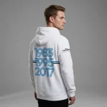 O conforto de quem tem história pra contar. Moletom canguru branco com capuz, feito em algodão puro. Pra usar no frio do estádio ou em qualquer canto do Brasil. A história aquece, o algodão também.